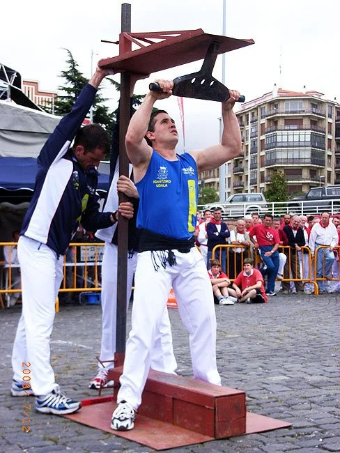 A variant of weight lifting. A person, using their own strength and without using any utensil or mechanism, lifts a stone, weighted or not, from the ground to their shoulder. Although in some towns the traditional stones of irregular shape are preserved, the main current Harri-Jasotzaileak use the four regular shapes: spherical, cylindrical, cubic and parallelepipedal.